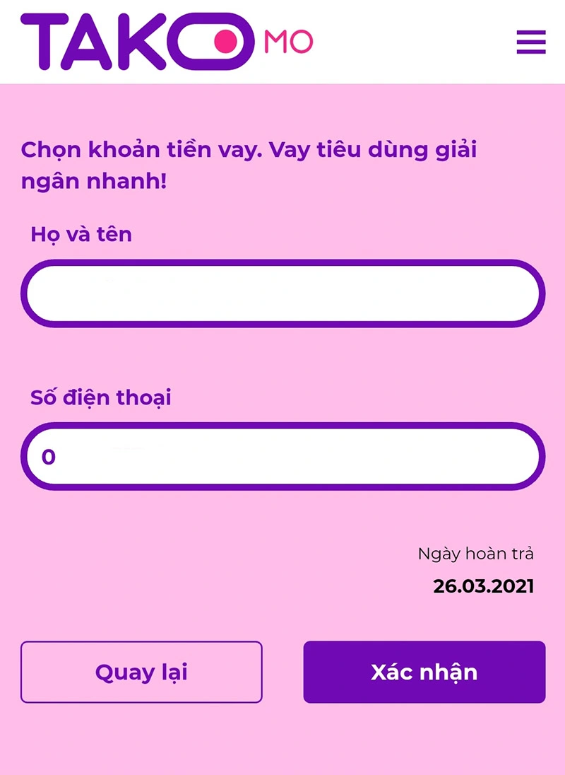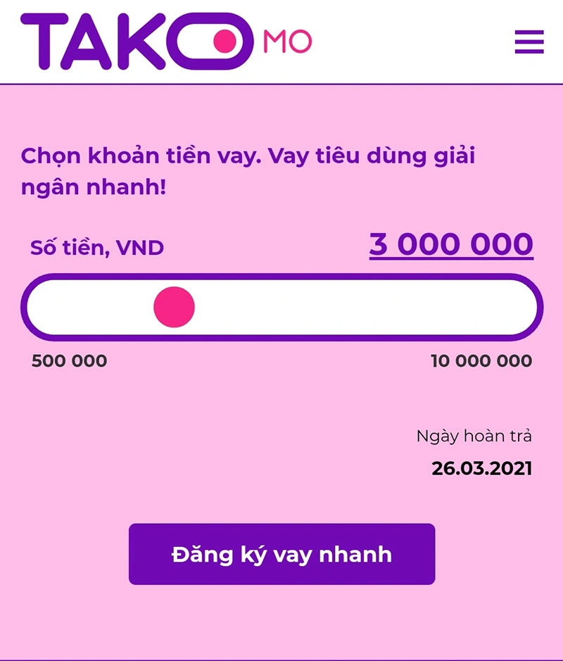 TAKOMO là nền tảng tư vấn và cung cấp các giải pháp tài chính được phát triển bởi Công ty TNHH EIB ASIA. Takomo mang đến cho khách hàng các dịch vụ tài chính cụ thể là những khoản vay online hạn mức từ 500.000 – 10 triệu đồng với thủ tục đơn giản, nhanh chóng và hoàn toàn trực tuyến, đáp ứng nhu cầu vay tiền gấp của khách hàng 24/7.