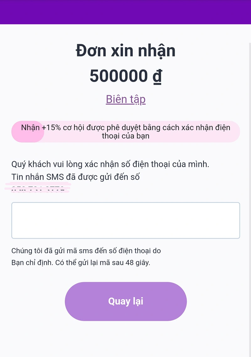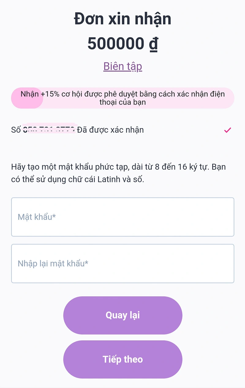 Lúc này hệ thống sẽ gởi cho bạn mã xác nhận đăng ký khoản vay qua số điện thoại, bạn nhập mã này vào ô và tiếp tục cài đặt mật khẩu cho tài khoản của mình.