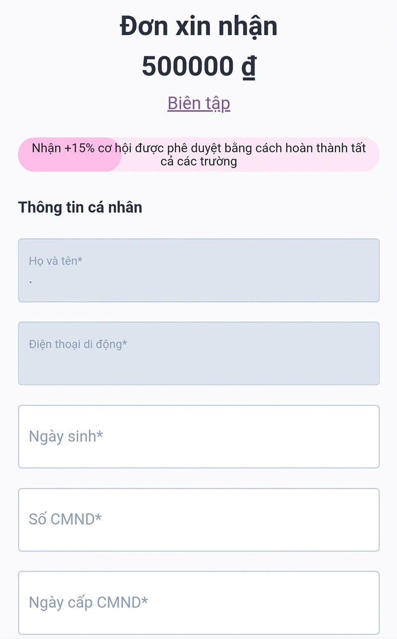 Ở bước này, các bạn cần điền đầy đủ thông tin cá nhân của mình một lần nữa gồm: Họ tên, số điện thoại, ngày sinh, Số CMND/CCCD và ngày cấp. Các thông tin được ghi phải thật đầy đủ và trùng khớp với CMND/CCCD mà bạn sử dụng đăng ký thì khả năng được các công ty cho vay sẽ cao hơn.