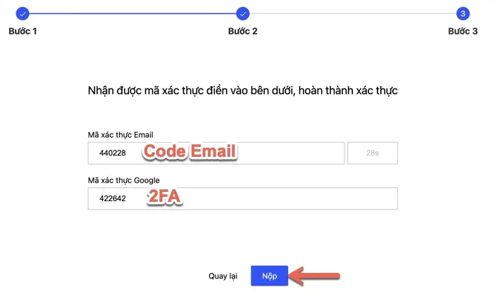 Bước 5: Nhập Code xác minh email và 2FA. Sau đó, nhấn vào “Nộp” để hoàn tất.
