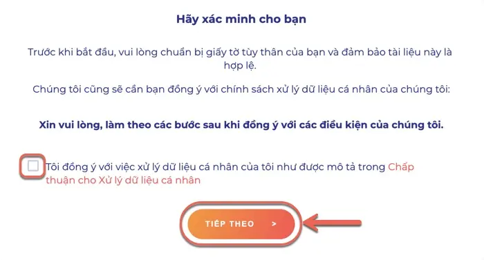Bước 2: Tích đồng ý vào điều khoản và nhấn “Tiếp theo“.