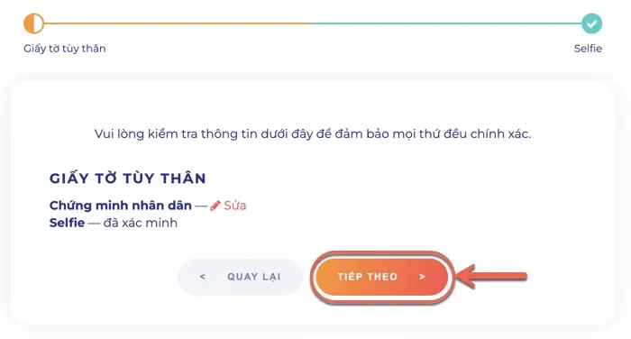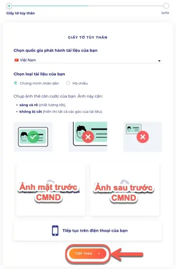 Bước 3: Upload ảnh mặt trước & mặt sau CMND rõ nét. Sau đó, nhấn vào “Tiếp theo“.