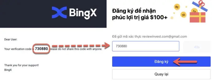 Bước 2: BingX sẽ gửi Code xác minh trong Email và bạn Copy để dán vào ô để đăng ký tài khoản BingX.