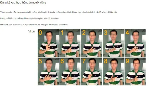 Bước 4: Bạn cần chụp và tải lên 4 ảnh chân dung với tư thế tay theo 4 số đuôi ID. Ví dụ số ID của bạn là 8158775, thì chỉ cần chụp hình với 4 số cuối là 8775 theo cách để tay minh họa như sau: