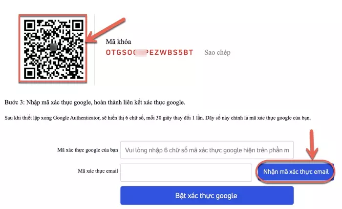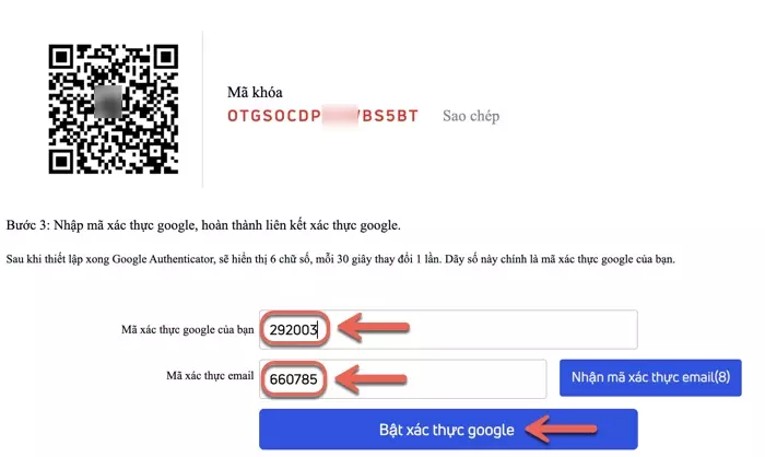 Bước 5: Nhập “Mã xác thực Google của bạn” và “Mã xác thực email“. Rồi sau đó, nhấn “Bật xác thực Google” để hoàn tất.