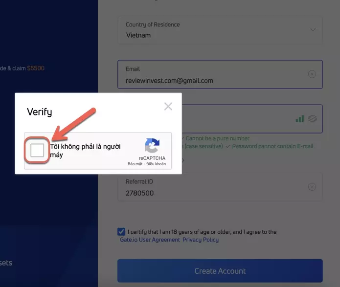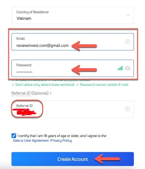 ĐĂNG KÝ NGAYBước 1: Truy cập link: https://www.gate.io/vn/signup và nhập thông tin đăng ký: