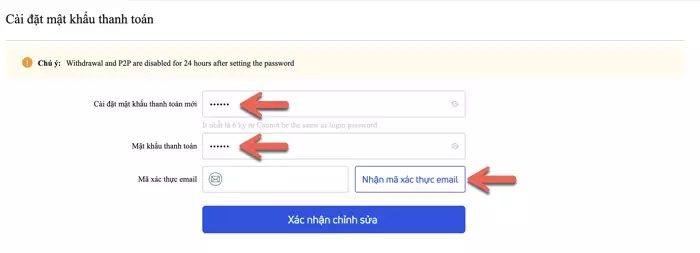 - Nhập mật khẩu thanh toán và nhấn vào “Nhận mã xác thực email“.