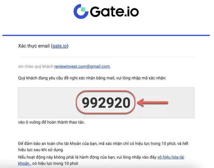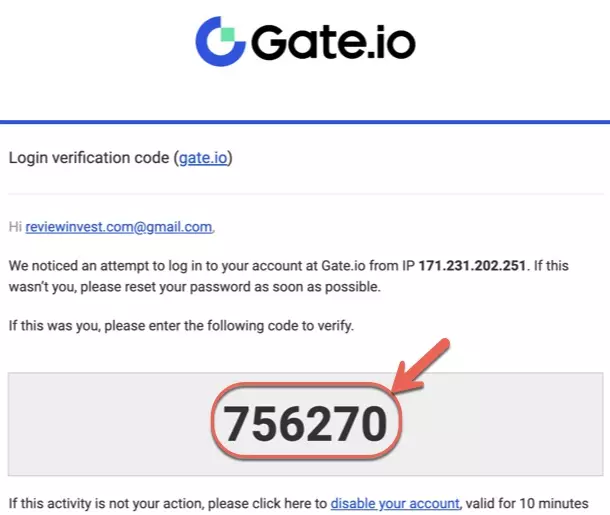 - Gate.io gửi code xác minh đăng nhập trong email.