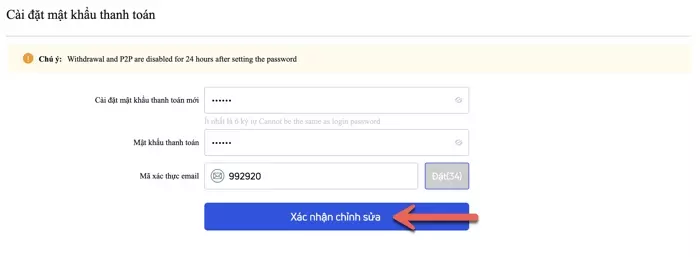 Bước 3: Nhập mật khẩu thanh toán (6 số, khác với mật khẩu đăng nhập) và Xác thực email.