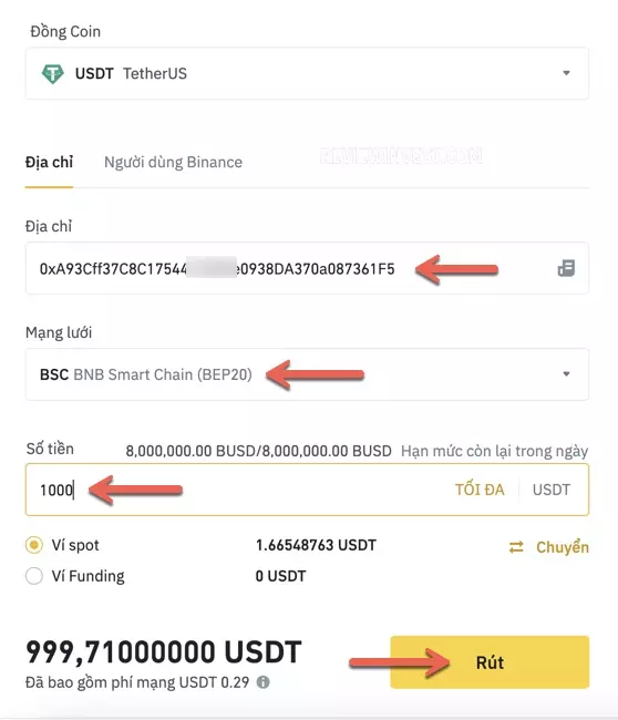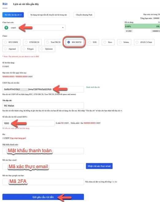 Bước 3: Thao tác rút tiền, chọn và nhập thông tin. Trong trường hợp này mình sẽ làm hướng dẫn rút USDT và mạng lưới BSC-BEP20, cần điền thông tin: