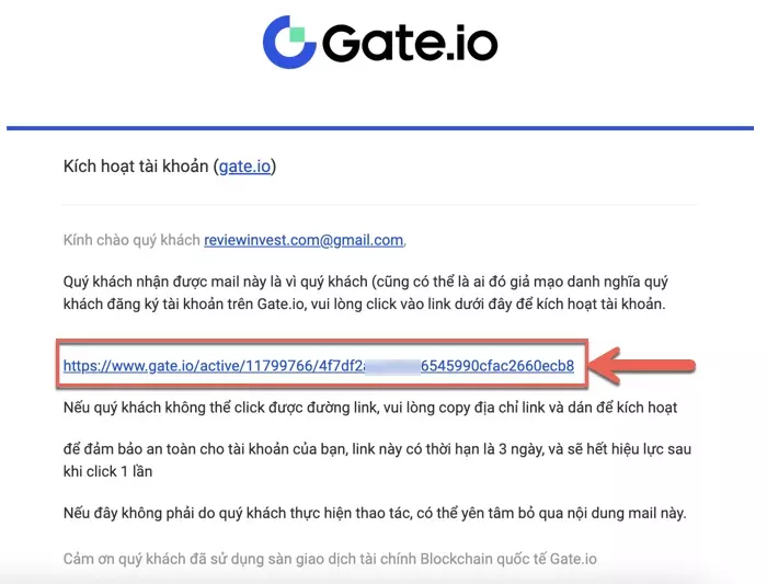 - Kiểm tra email để kích hoạt tài khoản (Hộp thư đén, Thư rác, Quảng cáo,…). Nhấn vào link Gate.io gửi để kích hoạt tài khoản.