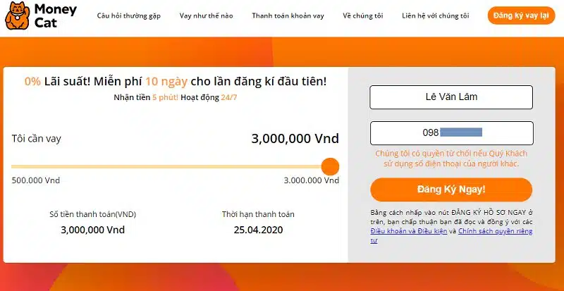 Ví dụ, khi bạn đăng ký vay 3 triệu cho khoản vay đầu tiên thì số tiền cần thanh toán chỉ là 3 triệu = tiền gốc. Với điều kiện bạn phải thanh toán đúng hạn trước ngày 24.04 (10 ngày kể từ khi được giải ngân thành công. Sau đó, bạn cung cấp họ tên và số điện thoại di động để đăng ký tài khoản vay trên MoneyCat.
