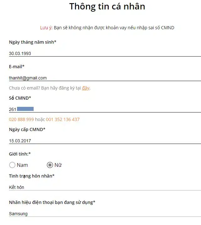 Các thông tin cần phải chính xác. Nếu bạn nhập sai số CMND, bạn sẽ không nhận được khoản vay từ MoneyCat.