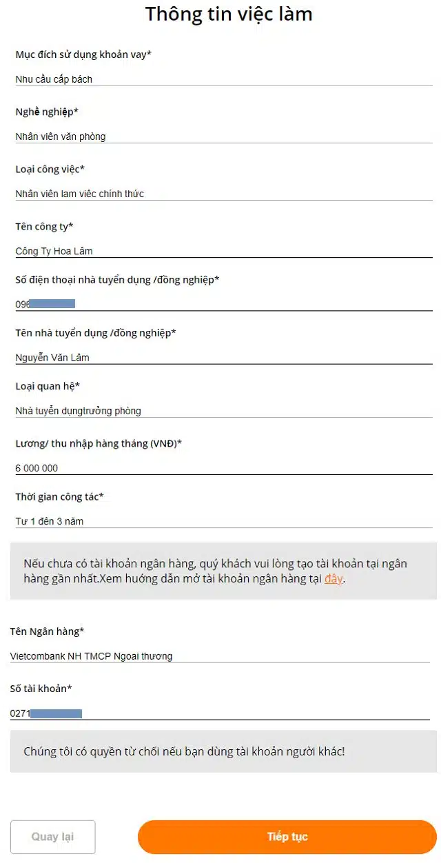 Sau đó, bạn điền thông tin về mục đích sử dụng khoản vay của mình, thông tin về công ty và số điện thoại của 1 người đồng nghiệp/ cấp trên nơi bạn làm việc. Đồng thời cho biết mức lương hàng tháng và thời gian công tác ở công ty.