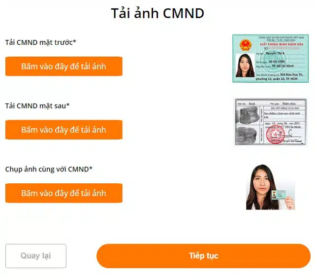 Bước này cũng rất quan trọng, vì thế bạn nên chụp rõ hình, rõ số CMND để hồ sơ được duyệt nhanh hơn. Sau khi chụp ảnh, bạn hãy chọn nút tải lên hệ thống. Sau đó nhấn Tiếp tục để chuyển sang bước tiếp theo.